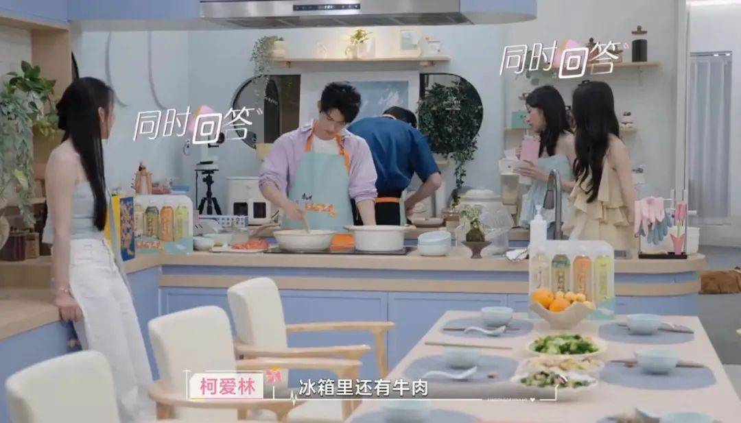 回到心动小屋,进入生活化的场景中,不管是在厨房做饭还是深夜闲聊,女生们大都换上更舒适的裤子或裙子,但还是都穿着无袖上衣。