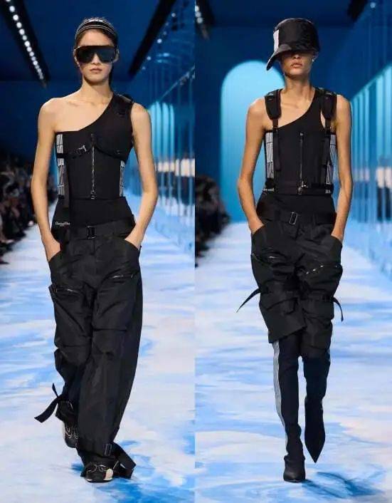 迪奥春夏成衣系列,风格硬朗的模特都露出了手臂线条。不同设计风格的上衣搭配工装裤,用又拽又酷的态度演绎无袖单品。